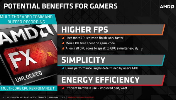 AMD對DX12並沒有怨言,反而盡情擁抱可以把Mantle幹掉的新標準——因為DX12和Vulkan兩個標準不僅能讓GPU顯卡受益,CPU更能從中獲益良多,這對AMD來說更是好事。